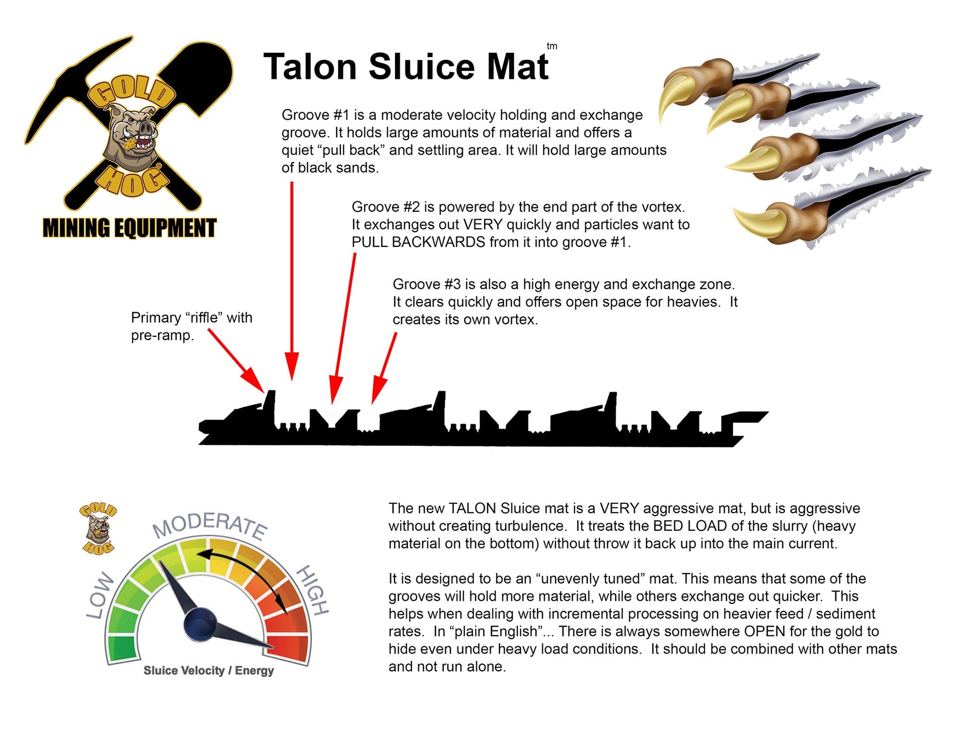 The Talon mat is Doc’s #1 workhorse mat. It has a massive BITE… but not a lot of turbulence. Great for highbankers, dredges, and stream sluices that have strong flow. It’s great for catching a WIDE variety of gold shapes and sizes, from large nuggets, to super fines. If Doc could only chose ONE MAT in his highbanker… this would be it.